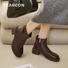 女靴冬季棕色短靴粗跟侧拉链瘦瘦靴通勤时装靴真皮女短靴